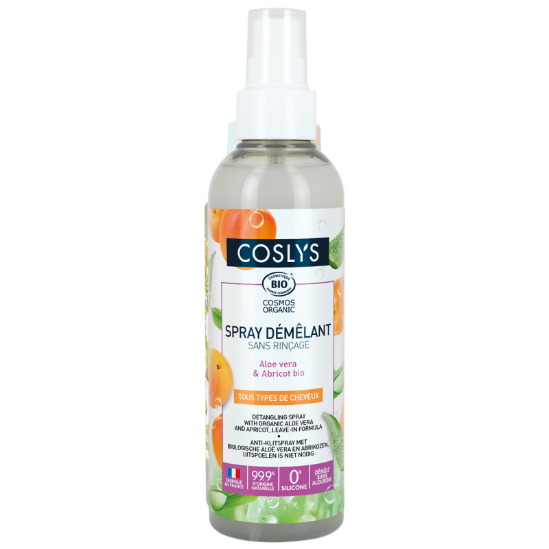 Le "Spray Démêlant Sans Rinçage" de chez Coslys pour tous types de cheveux démêle facilement les cheveux sans les alourdir. Sa brume légère enrichie en Aloe Vera bio et abricot bio est adaptée pour toute la famille (enfants à partir de 3 ans).