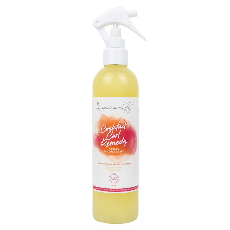 Le spray hydratant 'Cocktail Curl Remedy" de chez Les Secrets de Loly est un soin quotidien au parfum de framboise et de pivoine conçu pour les cheveux abimés, colorés, décolorés, secs ou fourchus. Il apporte plus de douceur et d'hydratation. Il scelle les fourches afin de préserver les longueurs tout en les hydratant. Il permet d'espacer les coupes grâce aux procédé d'encapsulation.