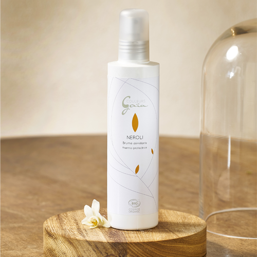 La Brume "Néroli" de Couleurs Gaïa est un spray démêlant sans rinçage qui facilite le coiffage tout en préservant la légèreté et la brillance des cheveux. Sa formule hydratante démêle instantanément sans graisser ni alourdir la chevelure. Enrichie en actif protecteurs, elle protège les fibres capillaires contre les dommages causés par les appareils chauffants (lisseur, boucleur) et contribue à fixer et prolonger l'éclat des colorations. Idéale pour hydrater, revitaliser et sublimer vos cheveux au quotidien, cette brume délicatement parfumée au néroli laisse une sensation de fraîcheur et de douceur durable.