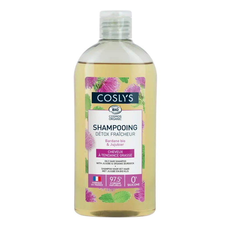 Le shampoing "Détox fraîcheur" de chez Coslys pour cheveux à tendance grasse régule l'excès de sébum. En même temps, il élimine les résidus de sébum et assainit le cuir chevelu sans le déshydrater. Grâce à sa base lavante enrichie en jujubier et extrait de bardane bio, il diminue les sensations de démangeaisons du cuir chevelu. Purifié, le cuir chevelu est propre et les shampoing s'espacent progressivement.