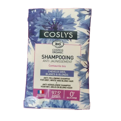 Le shampoing "anti-jaunissement" de chez Coslys formulé sur une base lavante douce protège les cheveux gris et blancs. La centaurée bio est riche en pigments 100% d'origine naturelle, aide à neutraliser les reflets jaunes indésirables. L'extrait de baobab lutte contre les signes du vieillissement de la fibre capillaire. Sa formule unique revitalise les cheveux les rendant plus souples, soyeux et brillants.