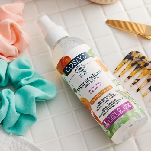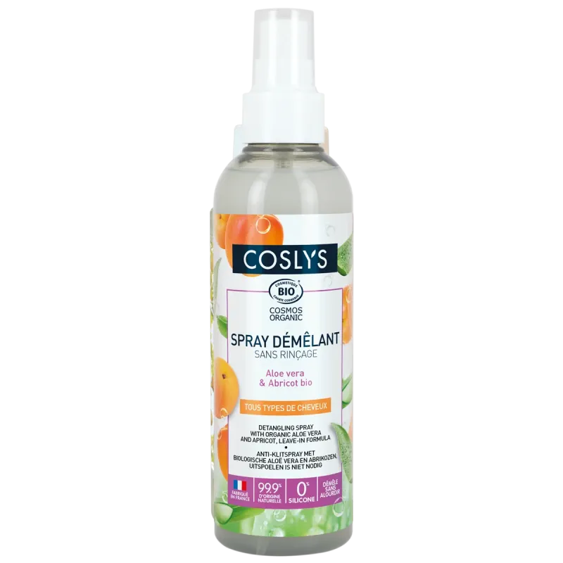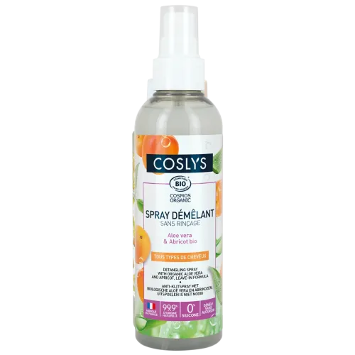 Le "Spray Démêlant Sans Rinçage" de chez Coslys pour tous types de cheveux démêle facilement les cheveux sans les alourdir. Sa brume légère enrichie en Aloe Vera bio et abricot bio est adaptée pour toute la famille (enfants à partir de 3 ans).