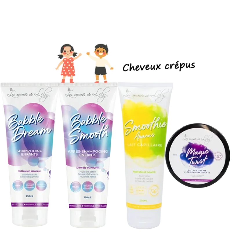 La Routine “Loly Kids Crépus” de Les Secrets de Loly est spécialement formulée pour répondre aux besoins des cheveux crépus des enfants dès 3 ans. Elle réunit quatre soins essentiels pour nettoyer en douceur, démêler, hydrater et sceller l’hydratation, tout en définissant les boucles.